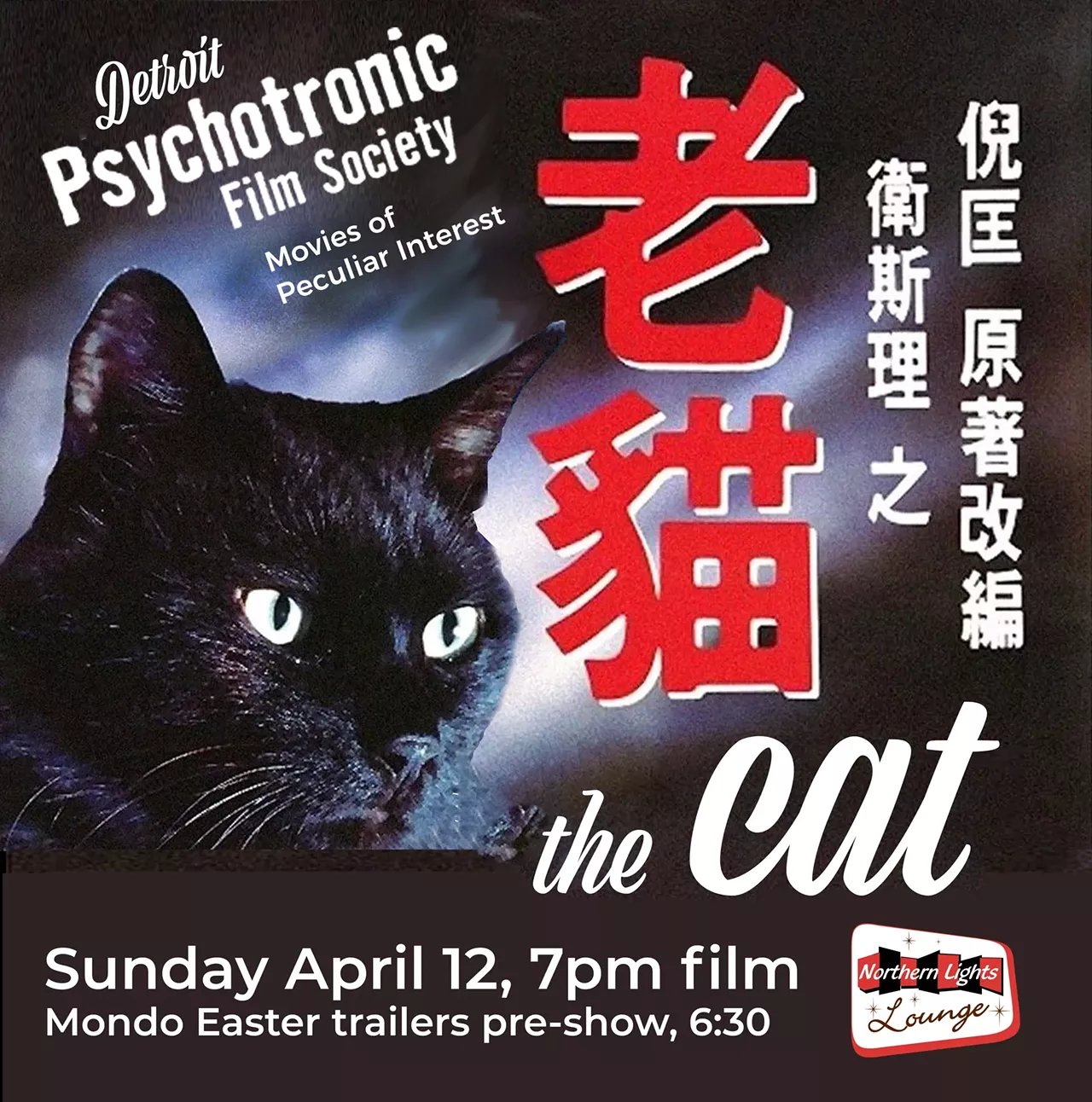 The Cat (1992, subtitles) “A cat from outer space teams up with a young girl to fight a murderous alien monster that possesses people” Film at 7, Mondo Easter trailers pre-show 6:30. FREE!!