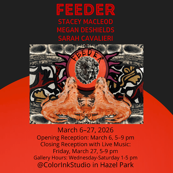 Color | Ink Studio & Gallery presents “FEEDER,” a group exhibition of work by a trio of Detroit artists: Stacey MacLeod, Megan DeShields, and Sarah Cavalieri. The public is invited to attend the Opening Reception on Friday evening, March 6 from 5–9 pm. It’s free, and guests will have the opportunity to meet the artists and discuss their work in person. Light refreshments will be available. There is free parking in the adjacent lot and on the side streets. Regular Gallery hours are Wednesday through Saturday, 1 to 5 pm. The show runs through March 27.
